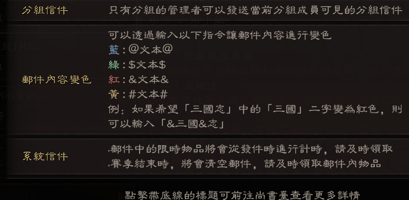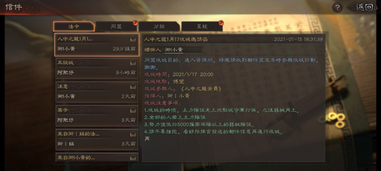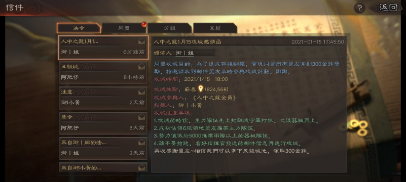 人中同盟的整體郵件內容和清晰度,在御丨姐的帶領下,逐步提升,而御丨姐本人也給我們分享了他對法令發送的經驗。基於遊戲內郵件系統的設定規則,法令是可以隨時調整和刪除的,而同盟信件是固定的,只能發送不能更改,所以在法令和信件內容的呈現上,他更傾向於將規則、任務說明和需要長久展示的內容放在法令上,將臨時指揮,小任務等需要大家即時關注的內容放在信件中,就如之前的指揮三連就是需要大家在特定的時刻接受的資訊,超過攻城時間後,就不用再看相關的信件,所以大家只需要看最新的一封信件就好,而不用去擔心錯過重要資訊導致成員不知所措。當然,這也給幹部團體提出了更高的要求。
