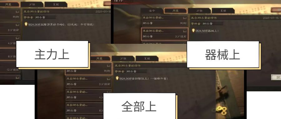 除了提前通知攻城任務外,御丨姐對攻城時的指揮還有一句自己的總結:‘主力上’、‘器械上’、‘全部上’。這三句話分別對應著攻城的三個階段,‘主力上’是開始攻城是需要利用主力隊伍去擊殺城池守軍,‘器械上’是在城池守軍被擊殺完成後,利用器械兵種的高攻城值去消耗城池的耐久值,而‘全部上’則是為了提醒在第一輪攻打主力時重傷的隊伍繼續進攻,另一方面也是提醒那些上線時間不確定的成員及時發兵。