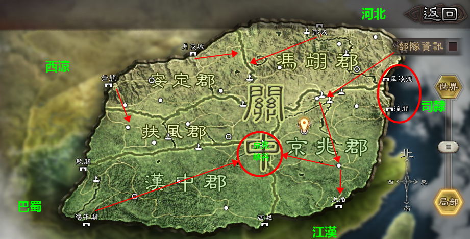 阪津出關之後,便可最快時間進入關中核心郡【京兆】,司隸的必經之路【風陵渡】和【潼關】也距離河北最近。同時整個賽季前中期最重要的關卡上洛對於關中三州來說,河北也是距離最近的。