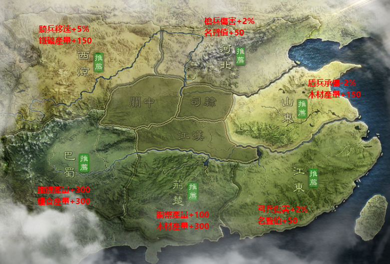 河北槍兵傷害+2%,江東弓兵傷害+2%,山東盾兵承傷-2%,這些都是屬於戰鬥對抗屬性,選擇這三洲會有對應的兵種屬性加成。