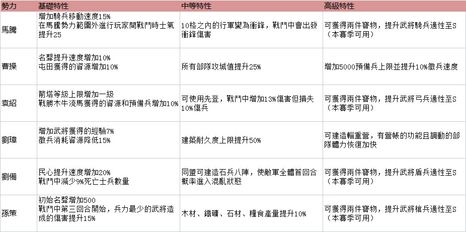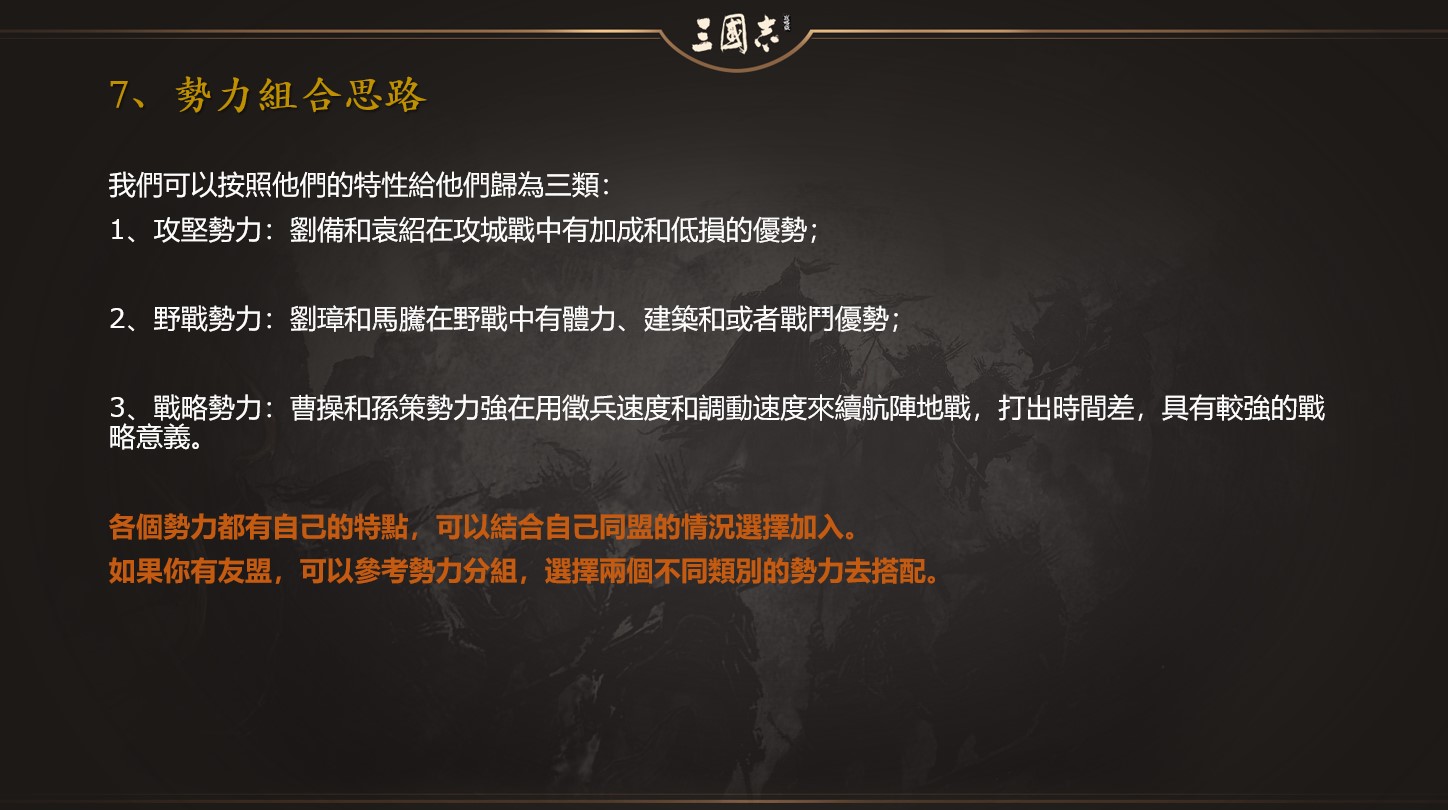 在以往的賽季我們都需要進行選州,每個州有不同的加成。而新賽季落州會有較大的改動,新賽季不再是落州而是選擇勢力。每個勢力會有更明顯的加成特點(詳細可參考上方圖片)。我們瞭解完勢力特點後可以按照他們的特性歸為三類:攻堅勢力、野戰勢力、戰略勢力。每個同盟可根據自身成員陣容強度,選擇最適合自己落州的勢力。如人數較多陣容較強的同盟可以嘗試把戰略實力作為新賽季首選,而像同盟內高戰比較少的同盟可以嘗試選擇野戰勢力來彌補陣容較弱的劣勢。