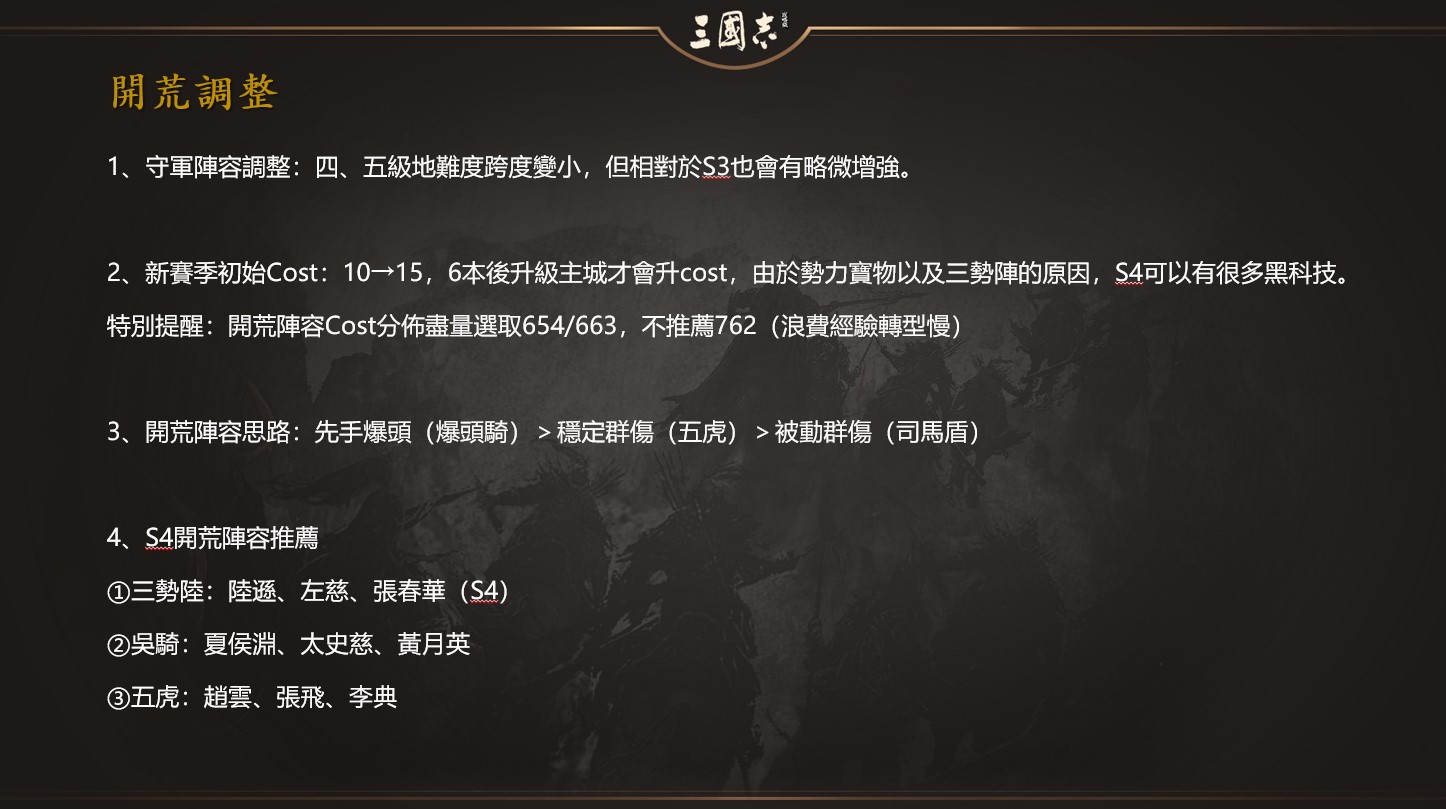 新賽季的開荒往往是各位玩家都比較關心而且頭疼的點。新賽季守軍陣容會有一定程度的提升,但與此同時新賽季初始Cost從10點升至15點,這就給更多的開荒陣容提供了可能,在三賽季橫掃的三勢陸在新賽季即可用於開荒,擁有較低的兵損穩定擊敗守軍,三勢陸為新賽季開荒首選。其次是吳騎,吳騎擁有較高爆發性輸出,能夠減少作戰回合從而達到低兵損開荒的目的。