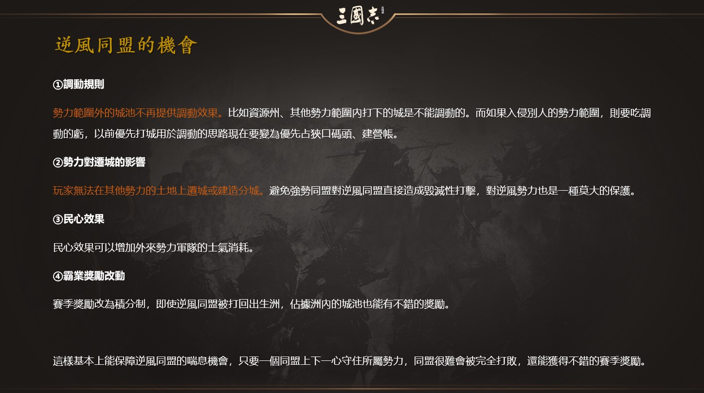 ④霸業改為積分制,對有望爭取霸業的勢力來說需要攻佔數量足夠的城池累積積分,而對實力較弱的同盟來說,在出生州內佔領足夠的城池同樣也能夠過得較好的獎勵。