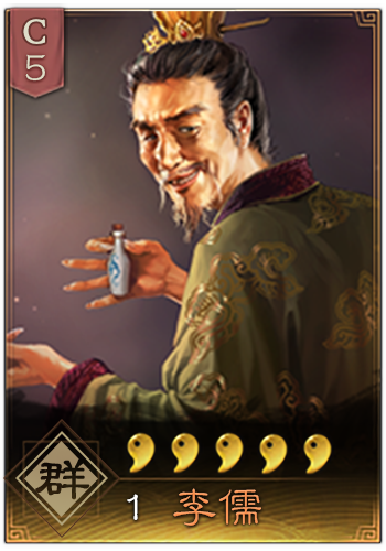 對敵軍單體施加鴆酒,降低其30%,持續1回合,1回合後毒發造成謀略攻擊(傷害率113%,受智力影響)同時降低其30點統率(受智力影響),可無限疊加,直到戰鬥結束